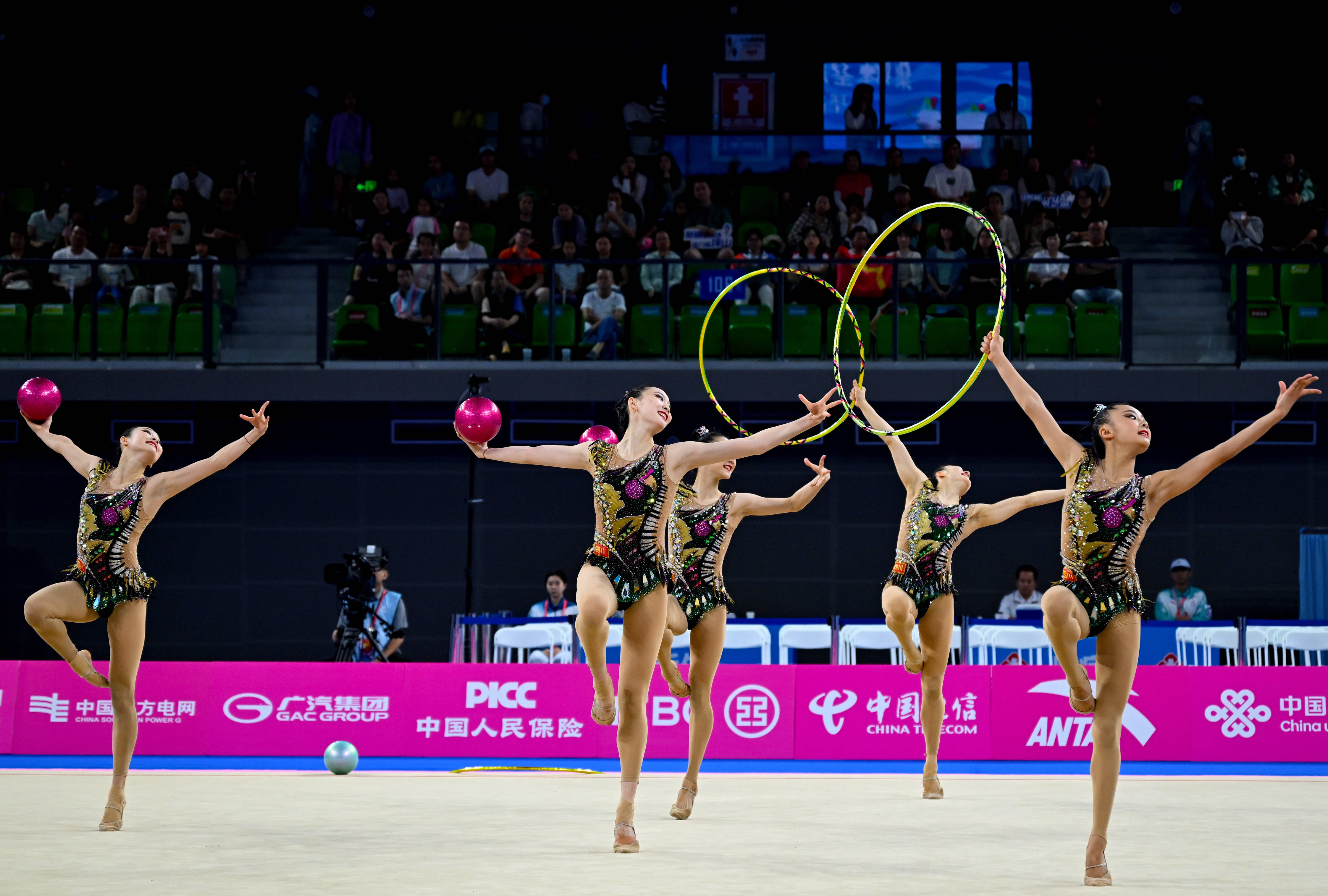 11月9日,四川队在3球2圈比赛中。新华社记者 郝源 摄率先亮相的四川队由肖明欣、陈佳琪、赵红玉、谭粤月、梁琪佳组成,该队先是以“国风味”十足的5带成套《春闺梦》获得24.50分,又在随后的3球2圈中拿下全场最高的25.80分,以总分50.30分排名第一,进入决赛。